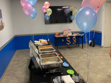 We have four spacious party rooms available to rent by the hour. Each room can accommodate up to 25 people. Rooms are adjoining and can be combined for larger groups. Every room also has a 70-inch flat-screen TV.